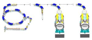 The layout of the light ion therapy device is illustrated in the figure below. It adopts the configuration of “a linear injector + a synchrotron + three treatment rooms (one horizontal fixed-beam treatment room and two treatment rooms equipped with 360° rotating gantries)”. The device primarily consists of an ECR ion source, a linear injector, a medium-energy beam transport system, a synchrotron, a high-energy beam transport system, and treatment terminals. The treatment terminals include the treatment control system, image-guided system, patient support system, laser positioning system, treatment planning system, and oncology information system, among others.
